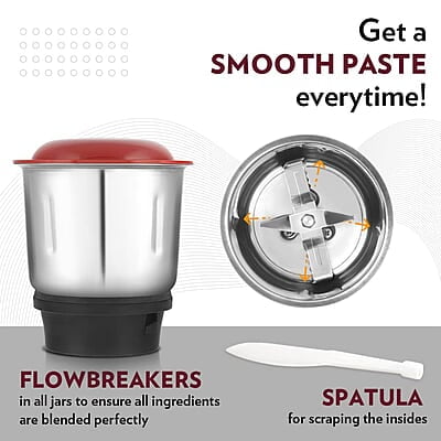 - EASY TO USE - This mixie for the kitchen is easy to use. The jar lids contain rubber rings to prevent leakage, flow-breakers for superior performance and anti-skid vacuum rubber feet. The mixer grinder also comes with a 1.5 m long power cord for convenience.