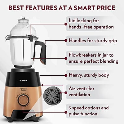 Borosil Fortuner Mixer Grinder Blender Juicer, Copper Motor, For Wet/Dry Mixing & Grinding, Blending Smoothies & Juicing Fruits 1000 Watts, 4 Jars (0.4L+1L+1.2L) (1.5L+1.5L+1.2L+0.4L)